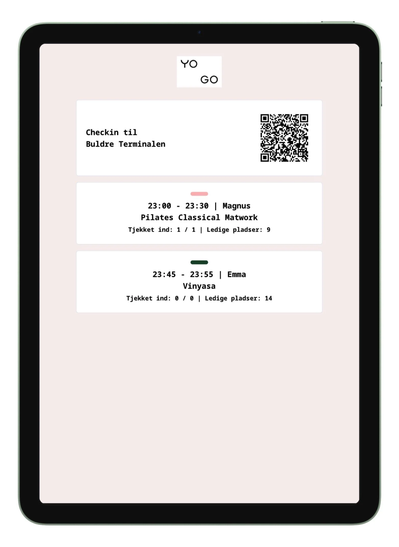 Der YOGO Check-in ist für die Nutzung auf einem Tablet optimiert – zum Beispiel für deine Rezeption. Wenn eine Kund*in im Studio ankommt, muss sie einfach nur ihren Namen auswählen und antippen. Danach wird die Person im System als anwesend registriert.